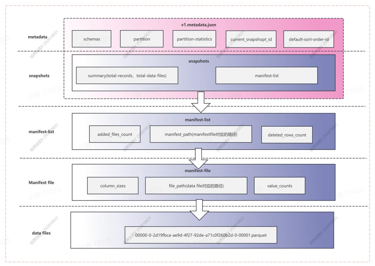 - 元数据通过快照(Snapshot)管理,实现时间旅行(Time Travel)和版本回滚。
