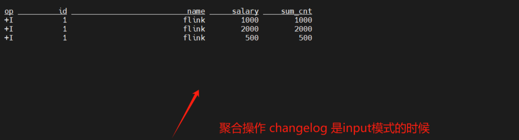 只保存变更,不做计算。图中输入时只有insert数据,因此变更只有 +I。