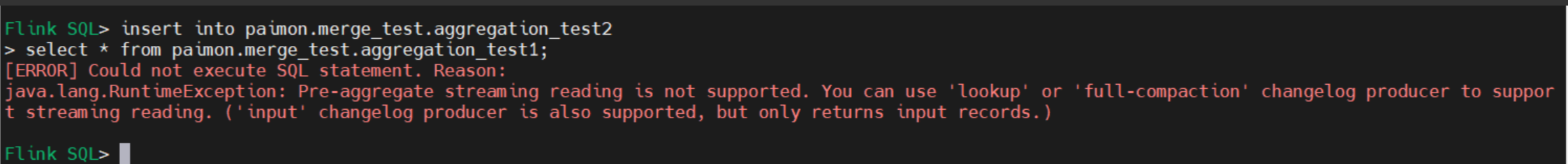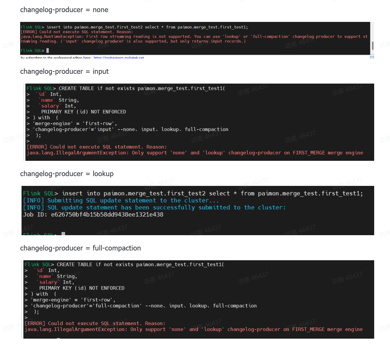 SELECT * FROM paimon.merge_test.first_test1 /*+ OPTIONS('scan.snapshot-id' = '1') */当merge-engine为first-row的时候,不是所有的changelog producer类型都支持。只有none和lookup类型支持,其他都报错。