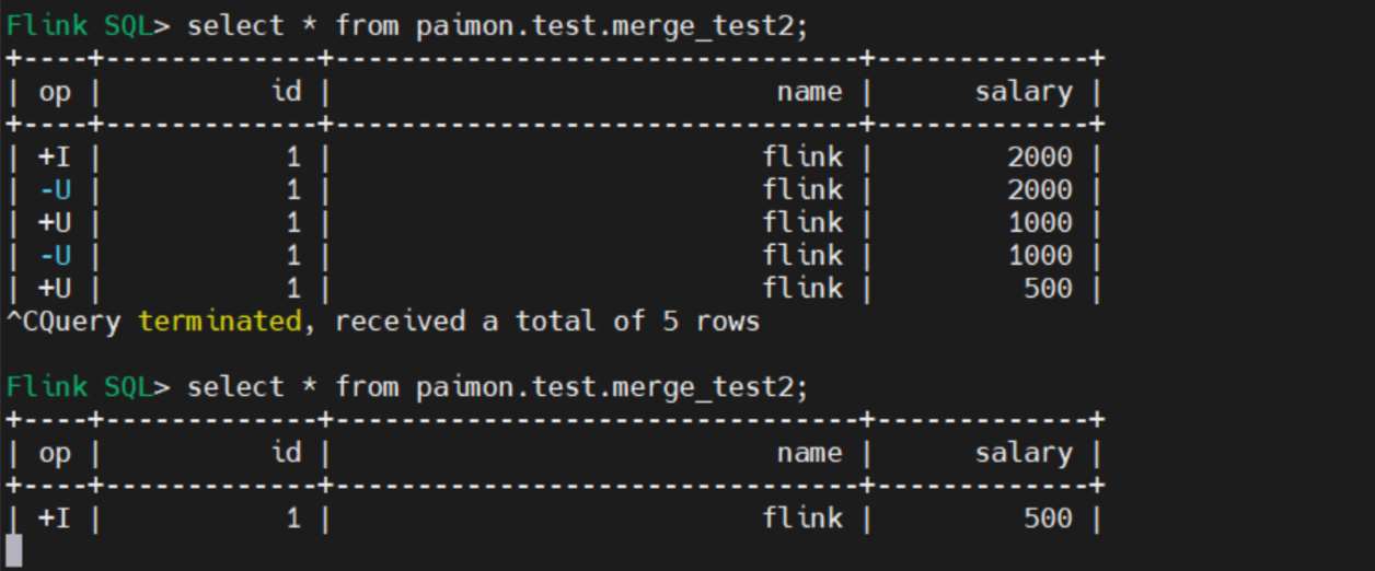 insert into paimon.merge_test.deduplicate_test1 values(1,'flink',500);结果只有最新的一条数据